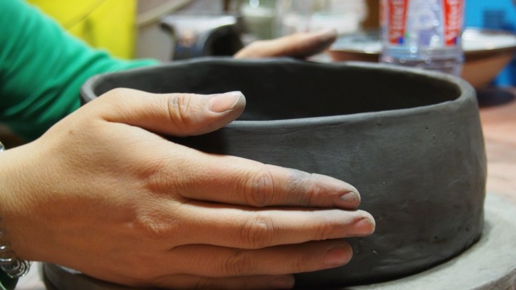 Pour le premier contact avec la terre, nos trois apprenties potières façonnent un bol à partir d’une boule d’argile. On creuse, on étire, on presse, on redresse cette terre qui ne cherche qu’à s’écarter de l’objectif.